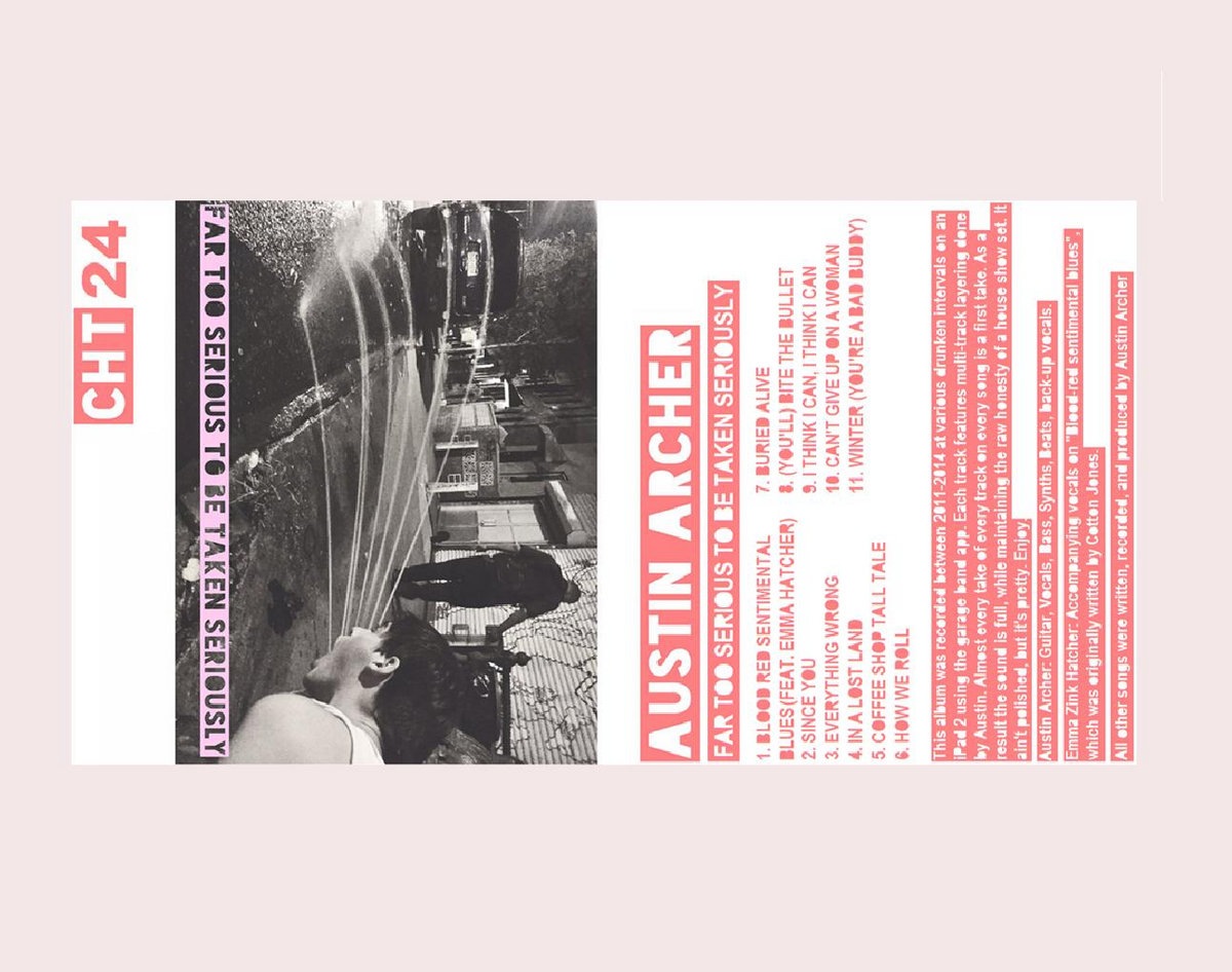 Limited edition cassette tape of Austin Archer's "Far Too Serious to Be Taken Seriously" for only four dollars, and that includes shipping! The tape comes in hot pink too so its nice to look at before you pop it and and let yourself be overtaken.